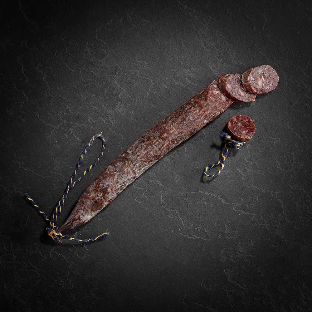 Elaborado a través de una minuciosa selección de las mejores piezas de las piernas de vaca premium, este salchichón es marinado y curado artesanalmente en las montañas de León (1.000 m) con carne deshuesada y tripa natural. Además, su ligero toque ahumado, fruto del uso de la encina y el roble, le otorga un valor único con un sabor más potente que el salchichón normal de cerdo.